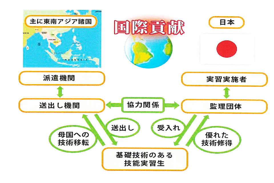 外国人技能実習制度は、日本が先進国としての役割を果たしつつ国際社会との調和ある発展を図っていくため、技能と知識を開発途上国への移転を図り、開発途上国等の経済発展を担う「人づくり」に協力することを目的として、平成5年に制度化されました。