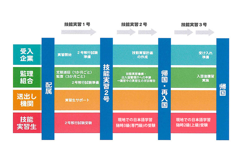 職種によりますが概ね特定技能1号という在留資格に変更し引続き同社で働くことができます。弊組合では登録支援機関としても登録しており、長期のサポートが可能になっております。特定技能1号は最長5年日本で働くことができる資格です。技能実習から合わせて8年雇用することも可能となり、その後の在留資格、特定技能2号へつなげることができればずっと日本に滞在できます。特定技能2号への本人へのサポート、申請も行っております。
